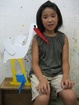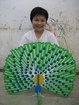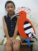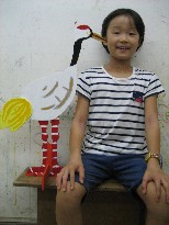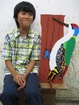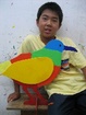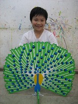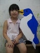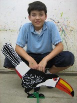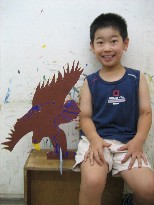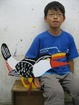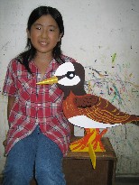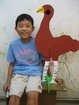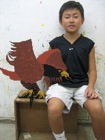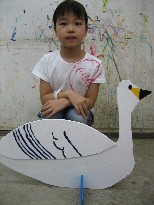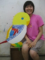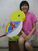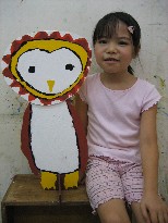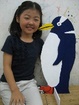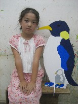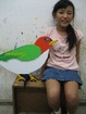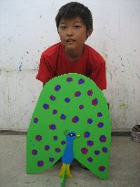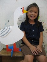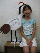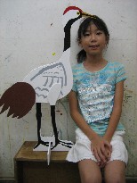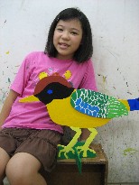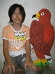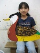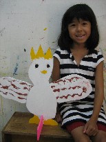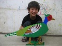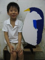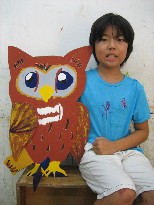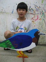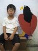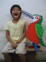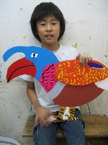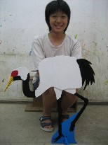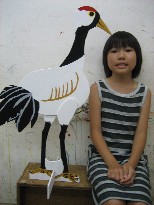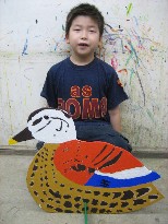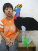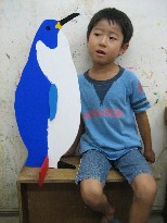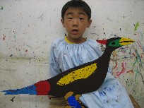 板で作る“立つ”とり。 ノコギリを使っているときのアトリエの暑いことといったら…。 出来上がった作品との記念写真は、 まるで、とりとお話しをしているみたい!